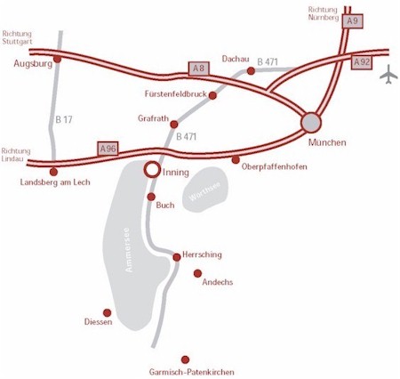 Autobahn A96 München-Lindau - Ausfahrt Inning a. Ammersee - B471 nach Inning Richtung Herrsching - bei Jet-Tankstelle rechts abbiegen und dem Weg bis zum Ende folgen. Der Broslhof liegt mitten in einem großen Garten mit Bachlauf.